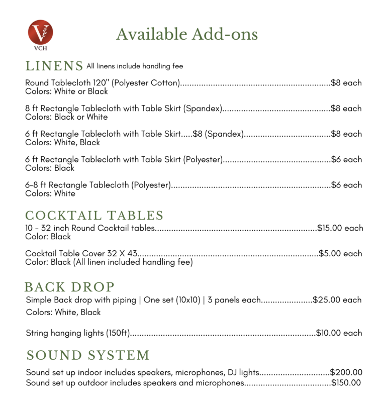 - A $200 cleaning fee applies to all rentals. Guests are responsible for removing all personal belongings, decorations, and trash from tables and bins before departure.