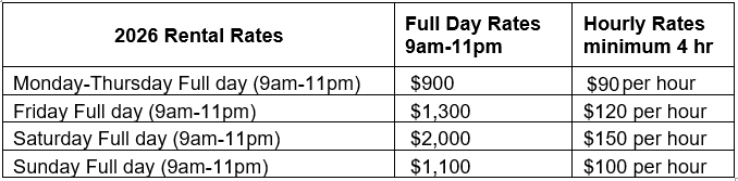 - Refundable security deposit of $300 is required at the time of booking. This deposit will be returned within 7-10 business days after the event, assuming no issues occur.